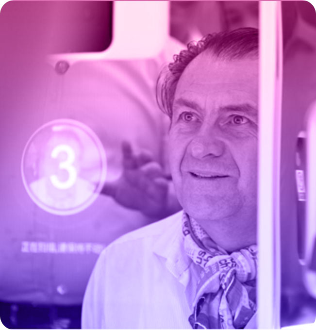 平静、自然地坐/站在飞瀑体检机器人面前